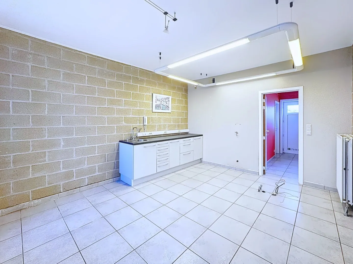 Indeling : inkomhal met wachtruimte, afzonderlijk toilet, ruimte 1 met watervoorziening, achterliggende ruimte/bureau, bergingen, kelder.