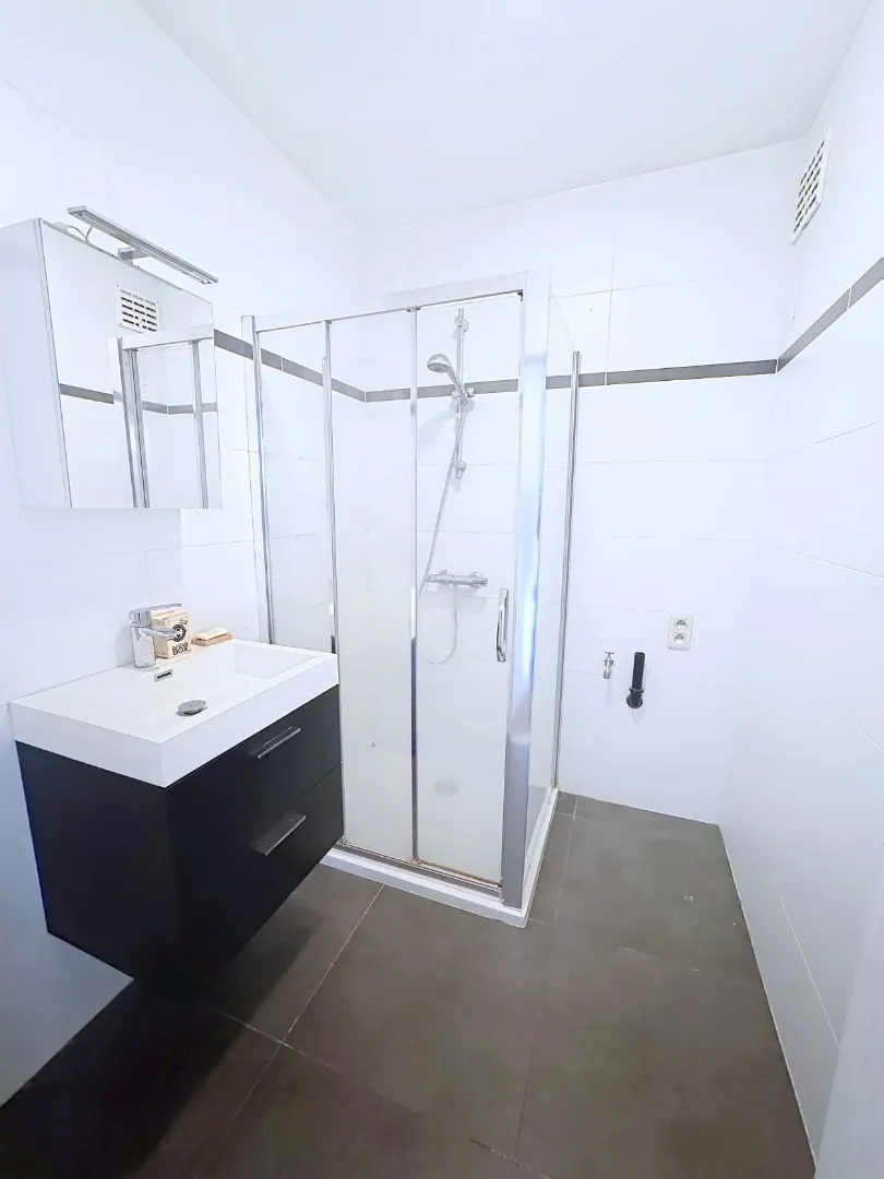 Indeling : inkomhal met ingemaakte kasten - leefruimte - slaaphoek - ingerichte keuken - badkamer met douche en lavabo - terras.