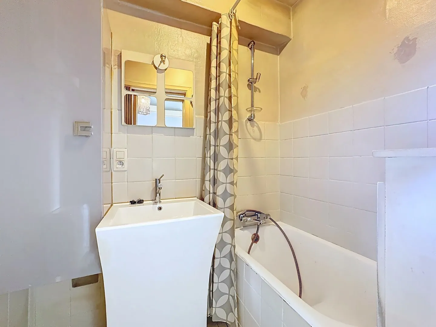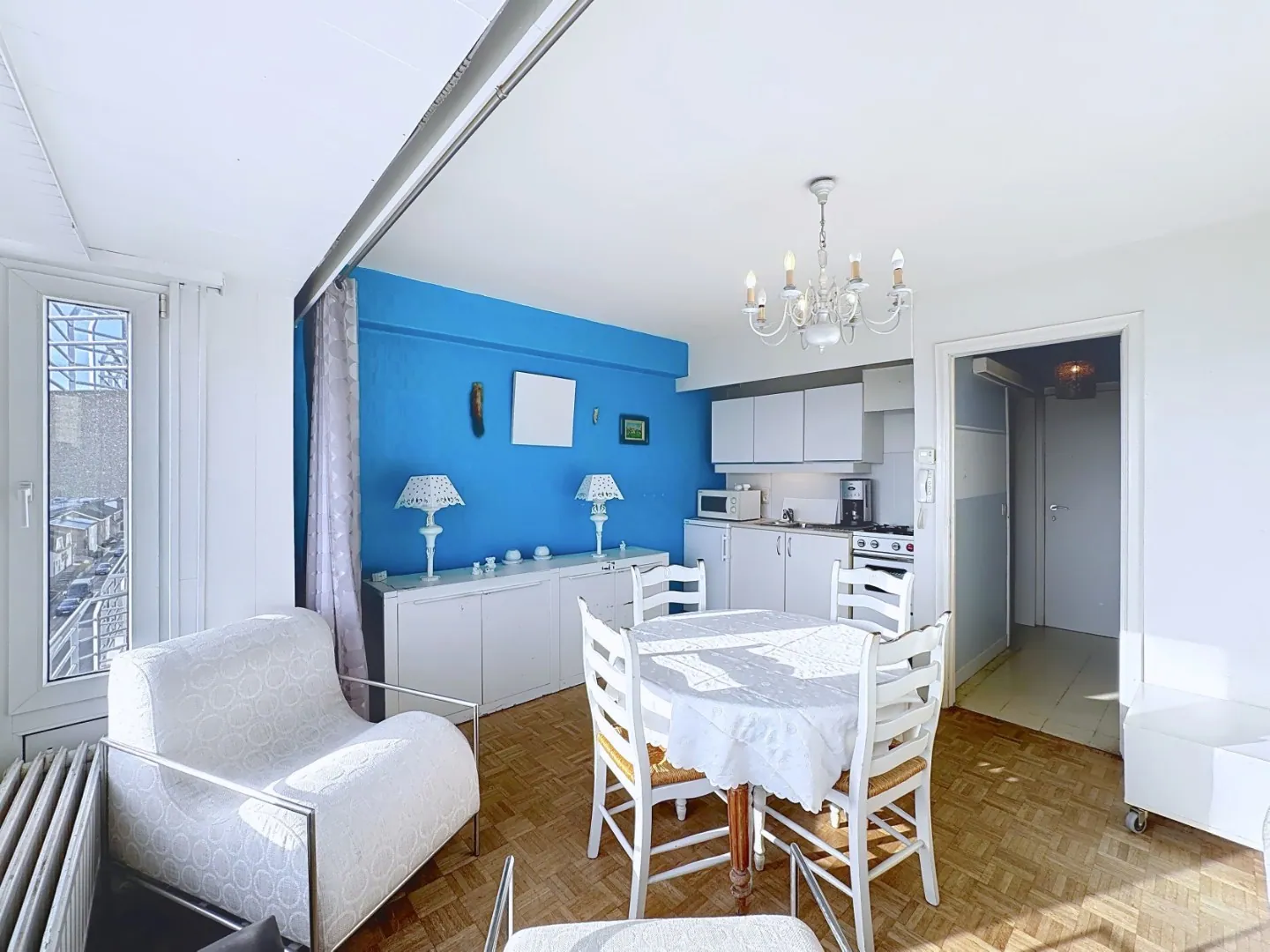 Indeling : inkomhal, leefruimte met open keuken, badkamer met ligbad, lavabo en toilet, slaaphoek.