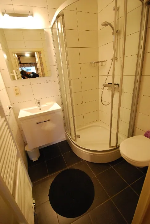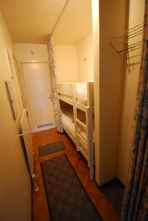 indeling: living met canape voor 2persone, stapelbed, badkamer met libad, lavabo en toilet,