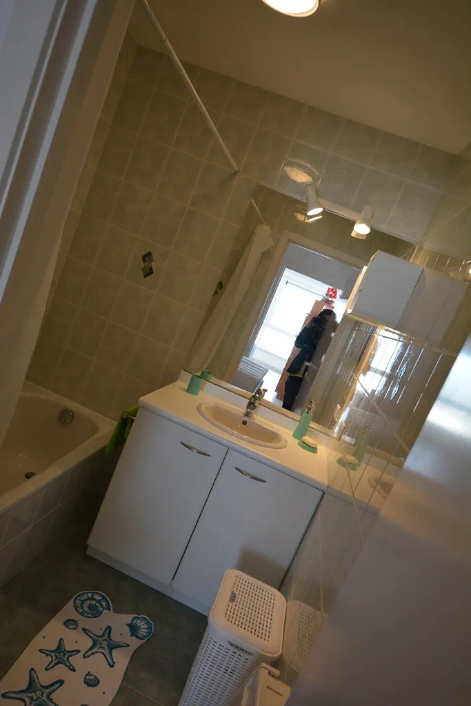 een ligbad en een lavabo, toilet apart, berging op het appartement.