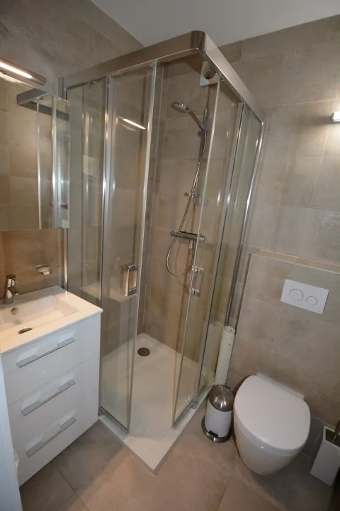 Volledig vernieuwde badkamer met douche, lavabo en toilet, slaapkamer met dubbel bed en lavabo,