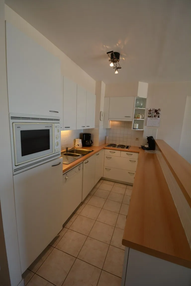 Indeling: ruime living met balkon en open ingerichte keuken met vaatwas, oven, microgolf, frigo,...