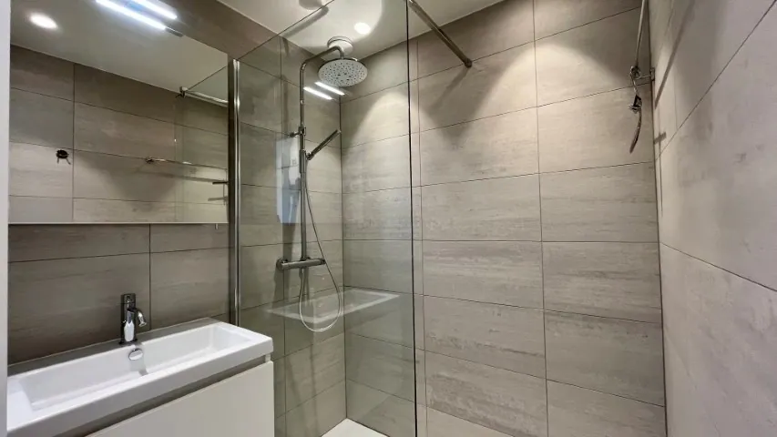 Badkamer met inloopdouche en lavabo, toilet apart, slaapkamer met dubbel bed en slaapkamer met stapelbed